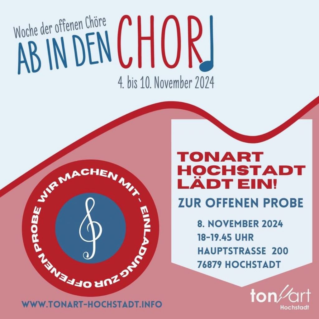 Deshalb laden wir am Freitag, 8.11.2024 alle interessierte Sängerinnen und Sänger um 18:00 Uhr zu einer offenen Probe in unseren Sängersaal (Hauptstraße 200, 76879 Hochstadt) ein.