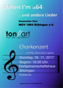 Am Sonntag, 26. November, gibt Tonart ein gemeinsames Konzert mit dem Gemischten Chor MGV 1864 Böbingen im Dorfgemeinschaftshaus in Böbingen. Das Motto des Konzertes lautet: