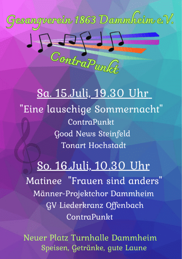 am Samstag, 15. Juli 2023 ist unser nächster Auftritt. Der Gesangverein 1863 Dammheim e.V hat uns eingeladen, zusammen mit ContraPunkt und Good News aus Steinfeld Euch „eine lauschige Sommernacht“ zu bereiten.